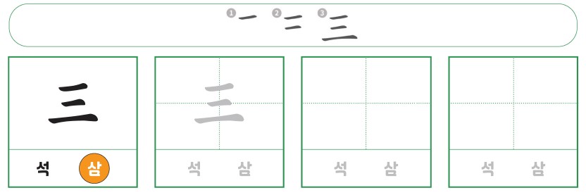 한자몬 웹사이트를 통해 ‘三(석 삼)’을 쓰는 과정을 살펴보았어요. 이번에는 연필로도 직접 한자를 써 봐요!