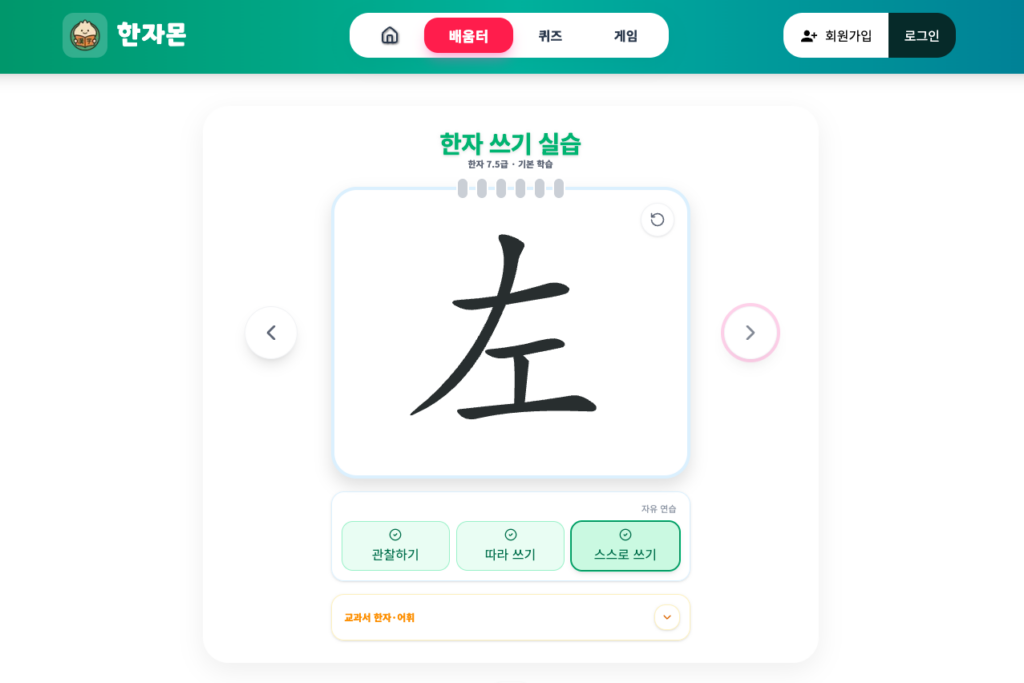 영상에서 한별이가 ‘왼 좌’를 배우자 ‘좌’ 한자몬을 구할 수 있었어요! 우리도 한자를 익히고 미션을 해결해서 한자몬을 구해요!
