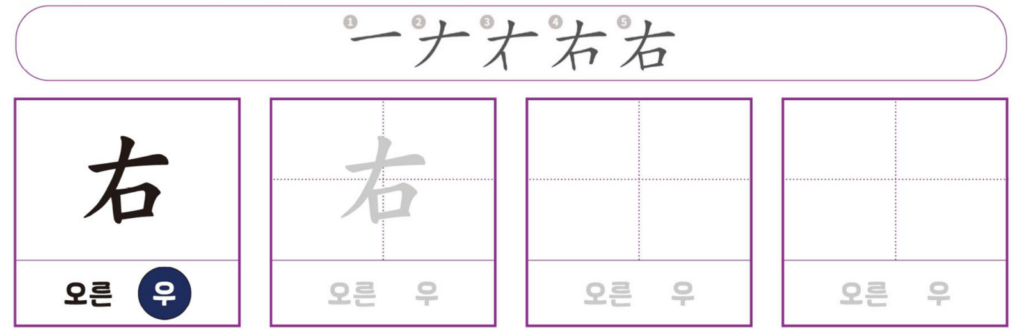 한자몬 웹사이트를 통해 ‘右(오른 우)’를 쓰는 과정을 살펴보았어요. 이번에는 연필로도 직접 한자를 써 봐요!