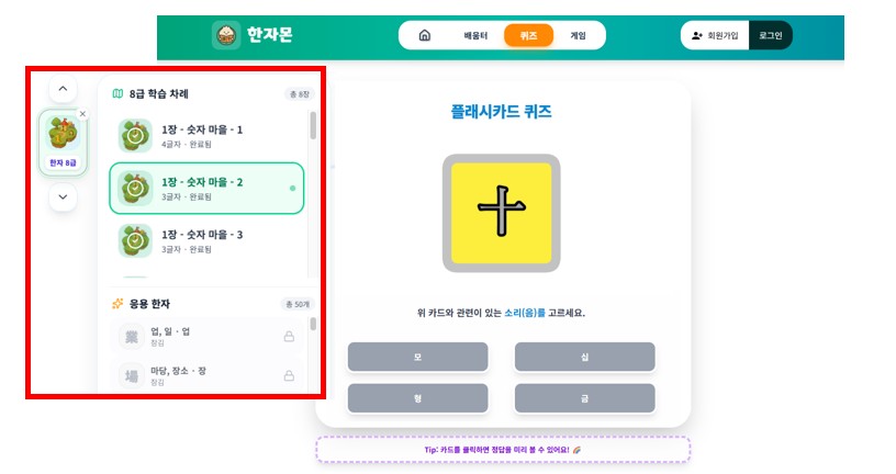 한자몬 웹사이트에 접속해서 ‘퀴즈’ 탭을 누르고 ‘1장-숫자마을-2’에 해당하는 플래시카드 퀴즈를 맞춰보세요