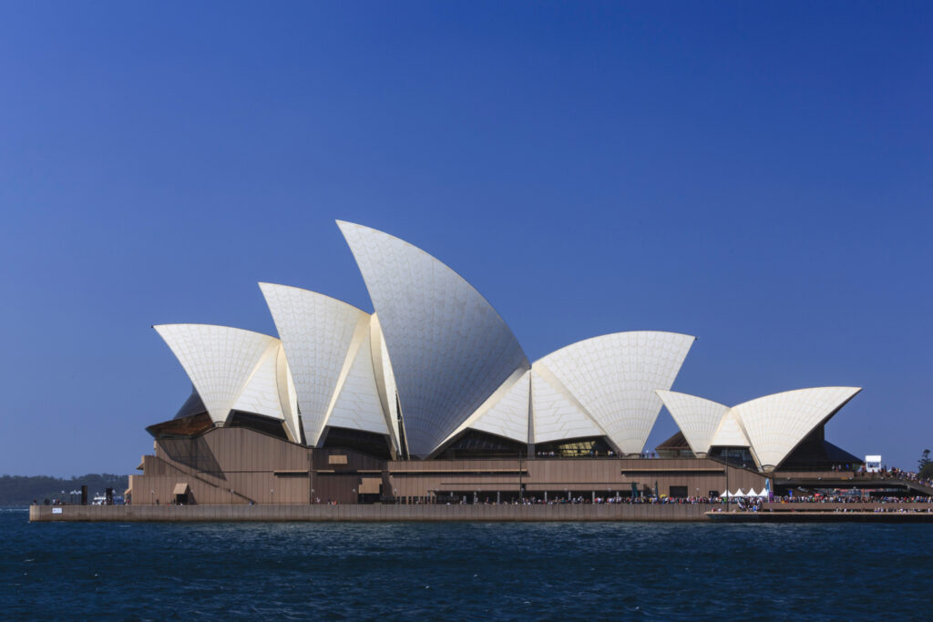 사진 속 오페라하우스는 어떤 모양처럼 보이나요? 오페라하우스 사진에서 가장 눈에 띄는 부분은 어디인가요?