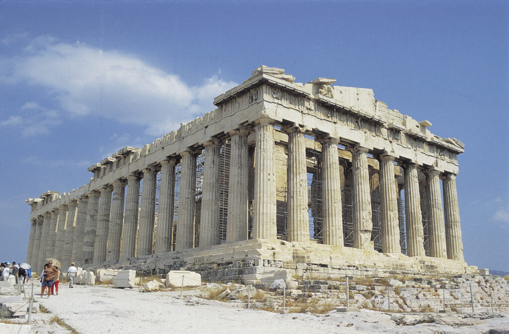 사진 속 파르테논 신전은 어떤 모양처럼 보이나요? 파르테논 신전 사진에서 가장 눈에 띄는 부분은 어디인가요?