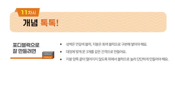 어때요? 이제 광화문을 직접 만들어볼 수 있을 것 같나요? 워크지 ‘개념 톡톡!’ 페이지 아래에 포디블럭으로 광화문 만드는 방법에 대한 설명이 나와 있어요. 잘 보고 다음 페이지의 퀴즈를 맞춰 봐요!
