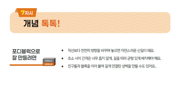 워크지 ‘개념 톡톡!’ 페이지 아래에 포디블럭으로 만리장성 만드는 방법에 대한 설명이 나와 있어요. 잘 보고 다음 페이지의 퀴즈를 맞춰 봐요!
