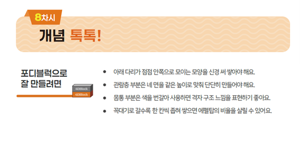어때요? 이제 에펠탑을 직접 만들어볼 수 있을 것 같나요? 워크지 ‘개념 톡톡!’ 페이지 아래에 포디블럭으로 에펠탑 만드는 방법에 대한 설명이 나와 있어요. 잘 보고 다음 페이지의 퀴즈를 맞춰 봐요!