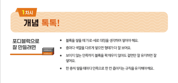 어때요? 이제 피라미드를 직접 만들어볼 수 있을 것 같나요? 워크지 ‘개념 톡톡!’ 페이지 아래에 포디블럭으로 피라미드를 만드는 방법에 대한 설명이 나와 있어요. 잘 보고 다음 페이지의 퀴즈를 맞춰 봐요!