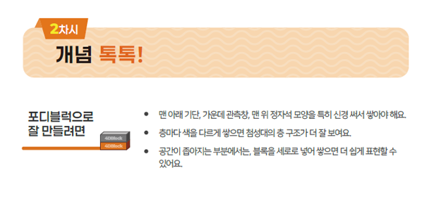 어때요? 이제 첨성대를 직접 만들어볼 수 있을 것 같나요? 워크지 ‘개념 톡톡!’ 페이지 아래에 포디블럭으로 첨성대를 만드는 방법에 대한 설명이 나와 있어요. 잘 보고 다음 페이지의 퀴즈를 맞춰 봐요!
