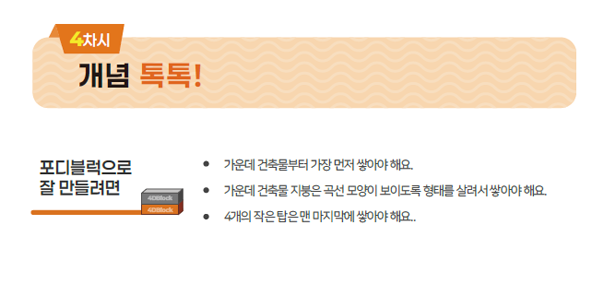 어때요? 이제 타지마할을 직접 만들어볼 수 있을 것 같나요? 워크지 ‘개념 톡톡!’ 페이지 아래에 포디블럭으로 타지마할 만드는 방법에 대한 설명이 나와 있어요. 잘 보고 다음 페이지의 퀴즈를 맞춰 봐요!
